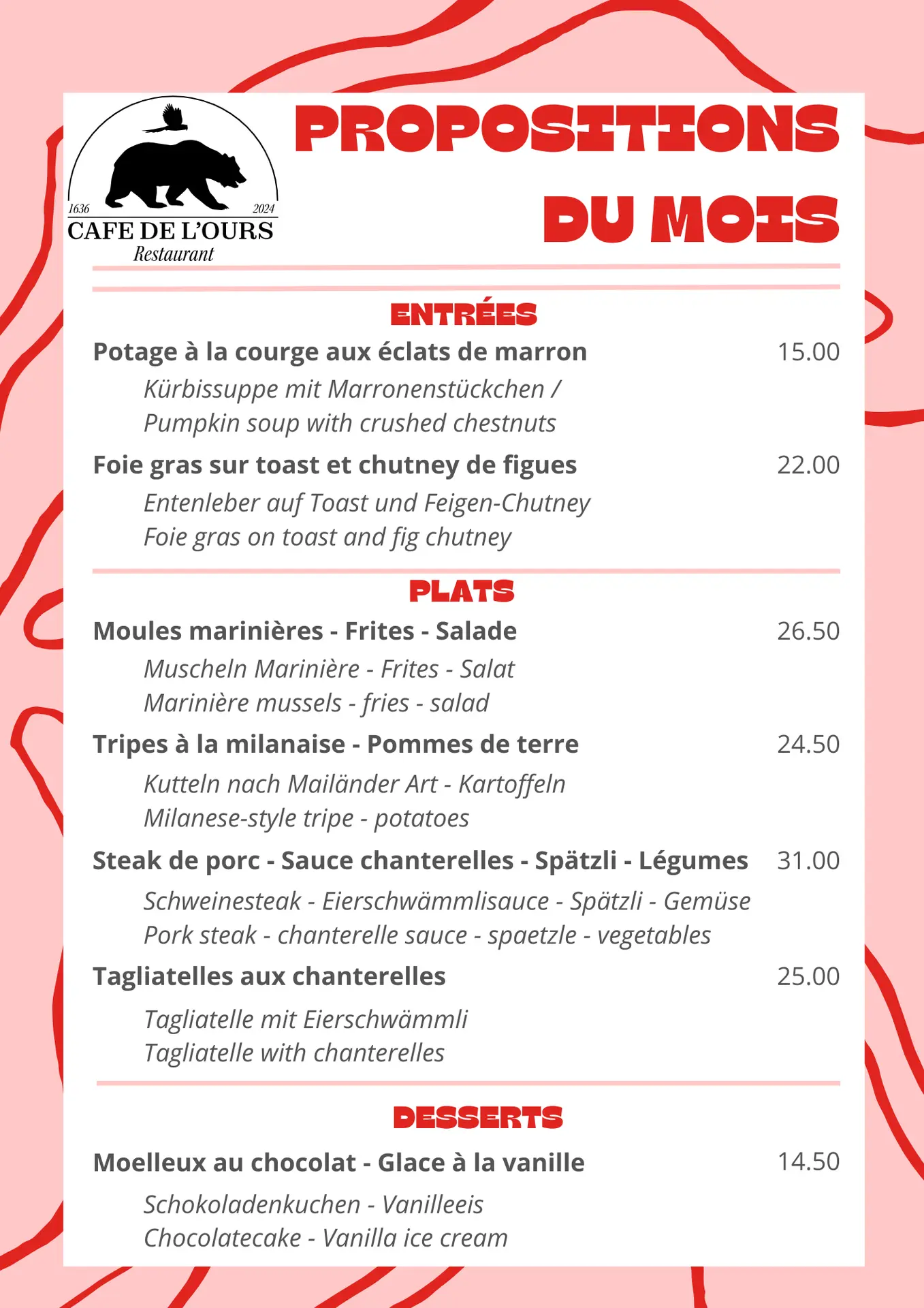 En tant qu'Auberge de l'Ours, notre établissement existe déjà depuis 1636. Nous conservons la tradition de l'Ours et revenons à ses racines avec notre cuisine fribourgeoise et nos produits régionaux. En même temps, nous osons un nouveau départ et vous invitons à des excursions culinaires dans le pays d'origine de notre deuxième animal emblématique, le perroquet brésilien.